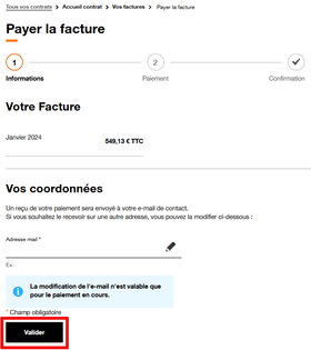 Pour continuer, entrez l'adresse mail à laquelle sera envoyé le reçu de votre paiement, puis cliquez sur Valider.