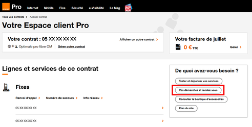 Vous pouvez gérer un rdv avec un technicien depuis Vos démarches et RDV au sein de votre Espace client Pro.