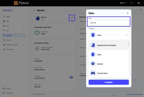 sur les modèles Flybox 2 5G et 3 5G+, seuls le nom et la catégorie de l'appareil peuvent être modifiés.