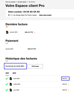 Votre Espace client Pro vous permet de consulter l'historique de vos douze dernières factures au format PDF. Vous pouvez les télécharger pour les consulter, les imprimer ou les enregistrer sur votre ordinateur. Découvrez comment y accéder.