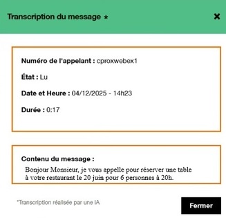 Sur le menu précédemment ouvert "Journal des communications" puis "Messages vocaux", cliquez sur l'icône "Document" pour lire la transcription du message.